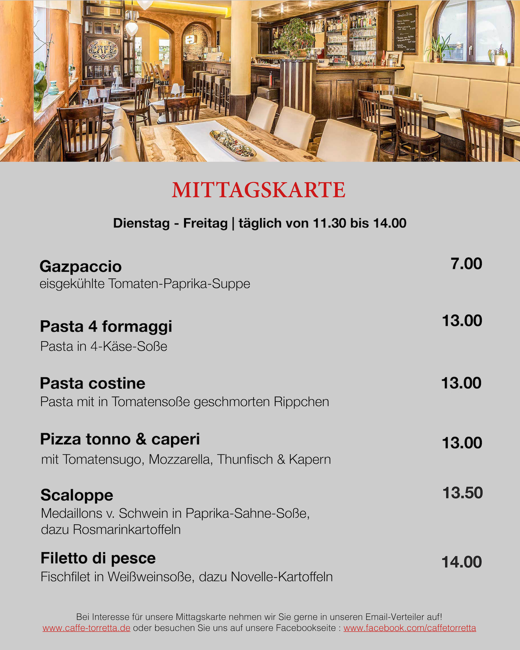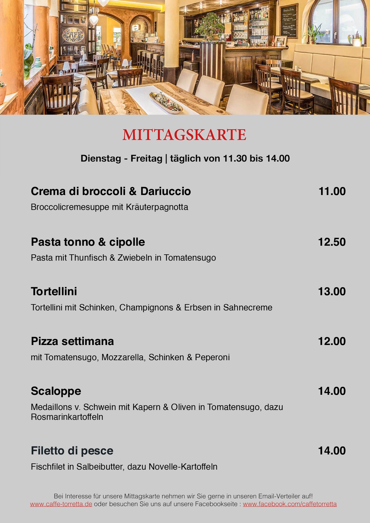 Mit unserem Newsletter, erhalten Sie immer die aktuelle Mittagskarte per Mail zugesandt.