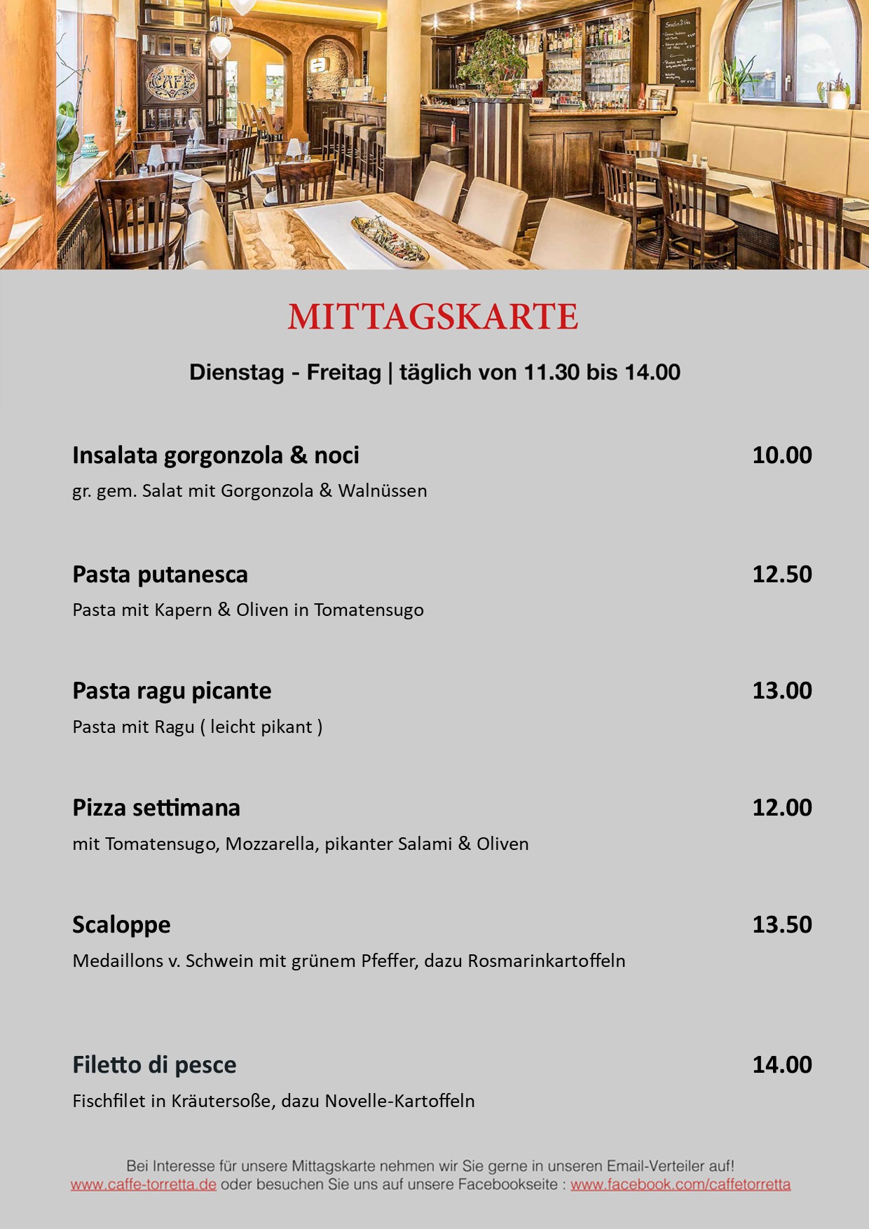 Das Ristorante Torretta ist ein Domizil für alle Freunde klassisch-italienischer Caffé-Bars und Restaurants. Der Tag beginnt mit einem warmen Cornetto mit neapolitanischem Espresso an unserer Bar oder einem reichhaltigem Frühstück im Gastraum oder auf der Terrazza. Mittags bieten wir wochentags (neben der regelmäßig wechselnden Abendkarte und unseren Pizzen aus dem Steinbackofen) eine Auswahl an schnellen und einfachen Gerichten.